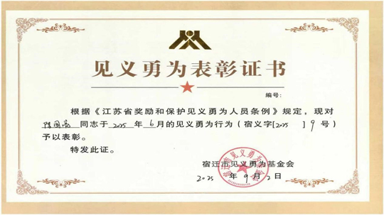 近日,園區(qū)蘇州公園工作人員陳國亮榮獲宿遷市見義勇為基金會(huì)“見義勇為”表彰。
